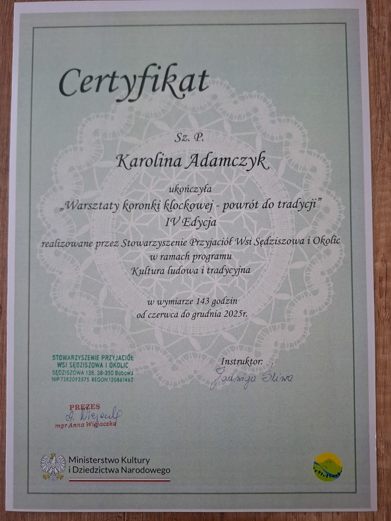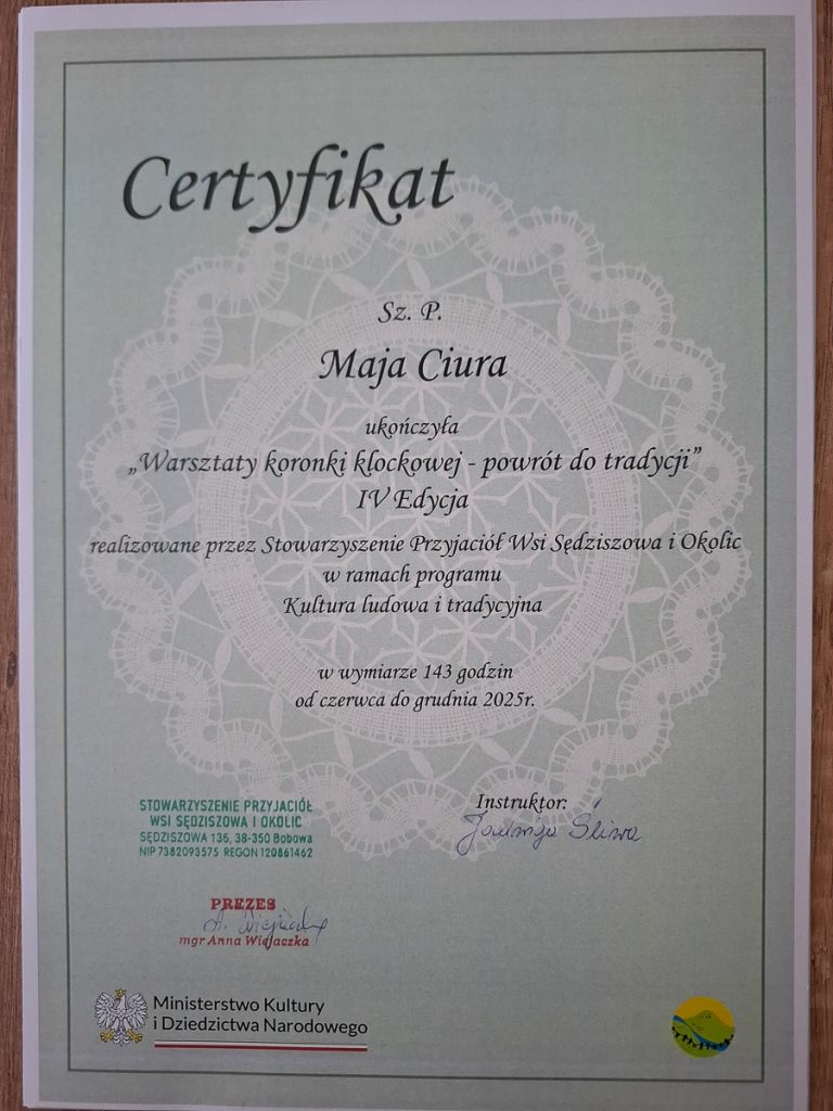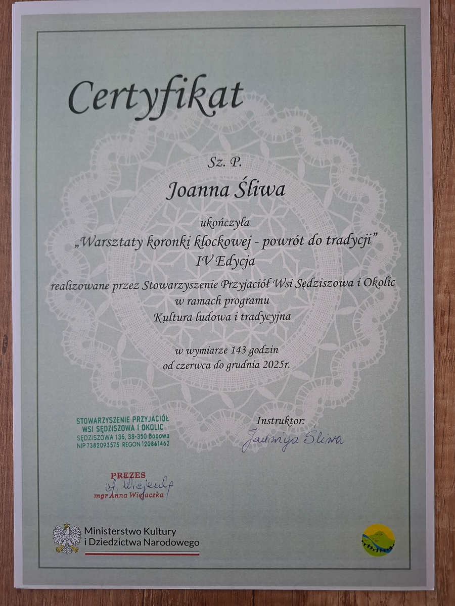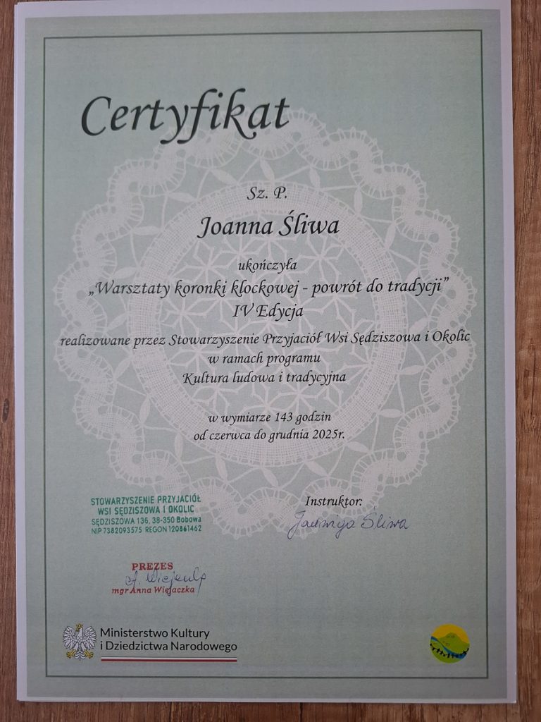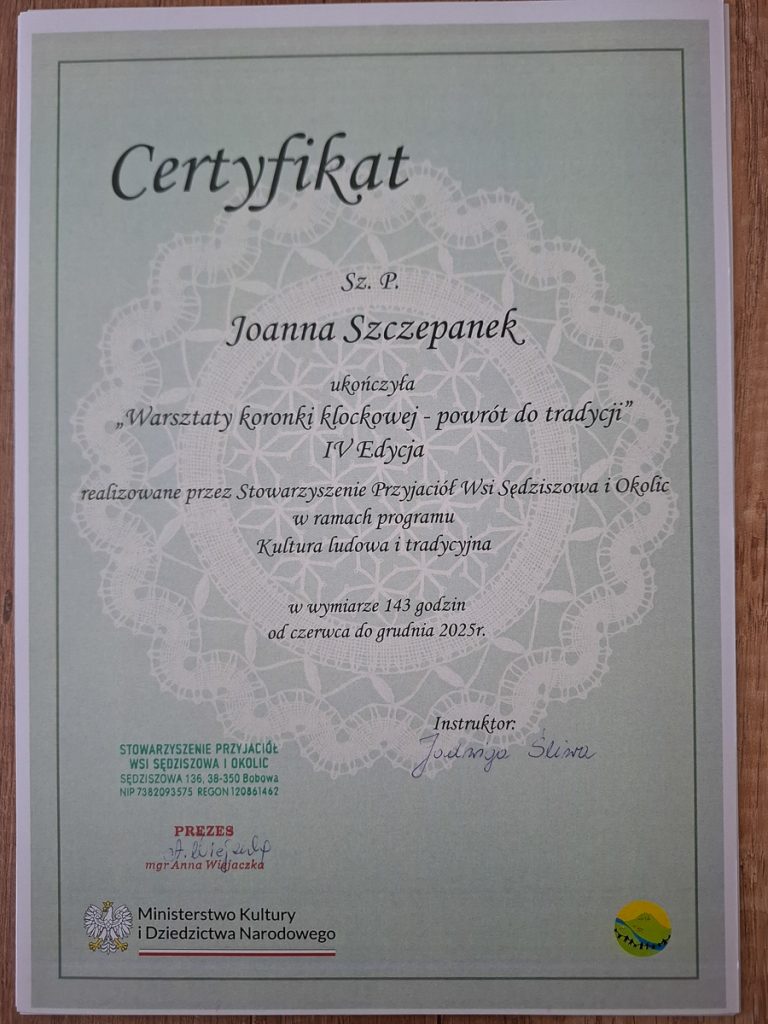 Stowarzyszenie Przyjaciół Wsi Sędziszowa i Okolic  zakończyło czwartą już edycję warsztatów bobowskiej koronki klockowej (2022, 2023, 2024, 2025). Głównym celem projektu było kontynuowanie przekazu unikatowej wiedzy i utrwalanie umiejętności z zakresu bobowskiej koronki klockowej, tak ważnej wizytówki rękodzieła artystycznego dla regionu etnicznego, jakim jest Ziemia Gorlicka.
